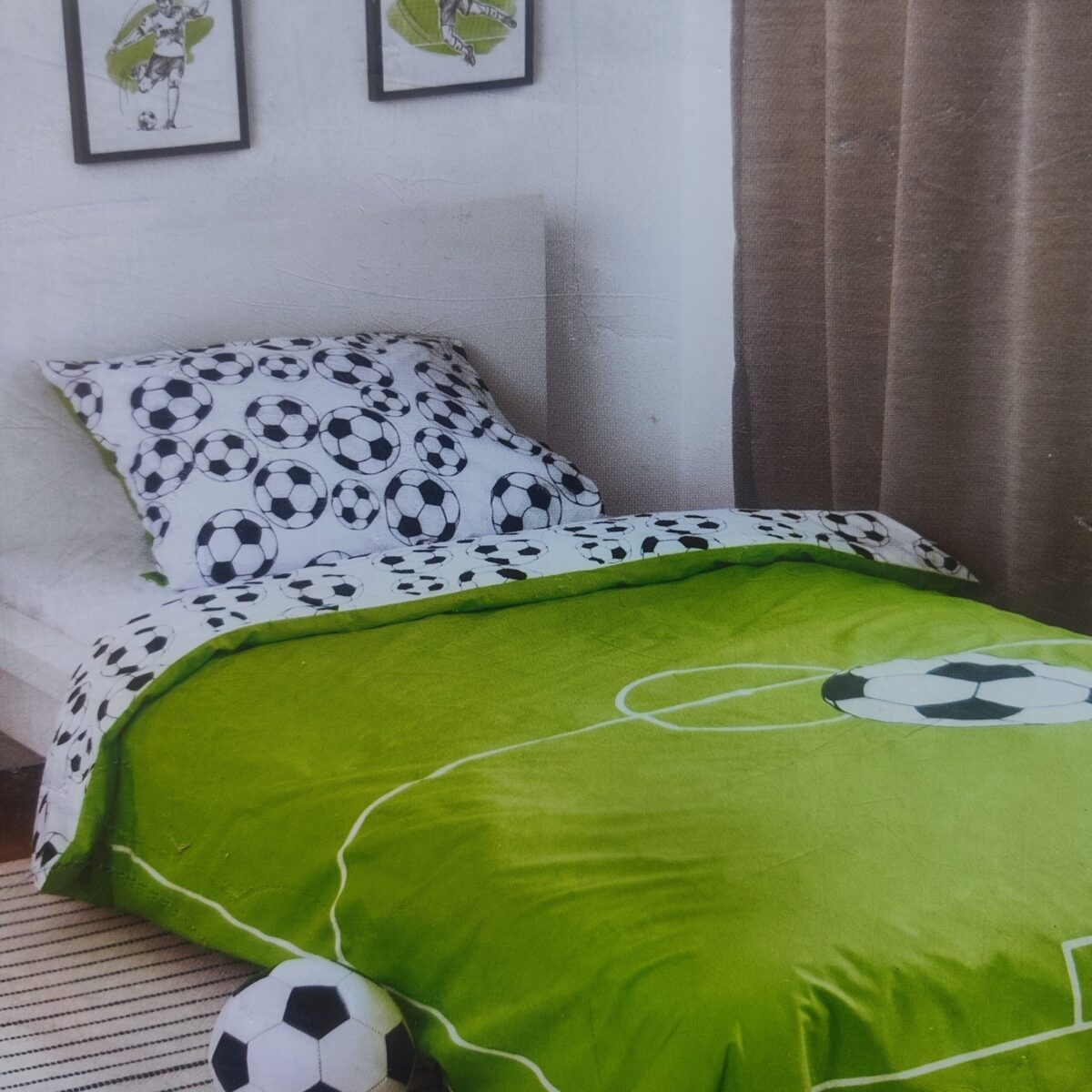 Šis vaikiškas patalynės komplektas puikiai tiks mažiesiems futbolo gerbėjams. Pagamintas iš 100% natūralios medvilnės, audinys yra švelnus, laidus orui ir malonus odai. Riškus futbo;o aikštės dizainas suteiks kambariui žaismingumo, o kokybiškas audinys užtikrina komfortą visos nakties metu.