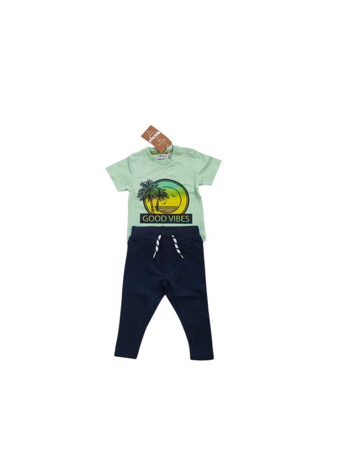 Minkšti , tamprūs džiogerių tipo kelniukai ir šviesiai žalios spalvos marškinėliai su „Good Vibes”spauda. Viršutinė dalis 95% medvilnė, kelnytės – 62% medvilnė, malonios ir kvėpuojančios. Puikiai tinka kasdienai ir aktyviam judėjimui. Skalbti 30`C. Dydis 74cm